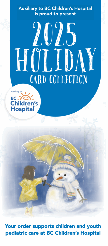 The 2025 Holiday Card Collection is now open! The Auxiliary to BC Children’s Hospital is proud to present the new selection of cards featuring original artwork by BC’s artists! Please visit our webpage for more info!